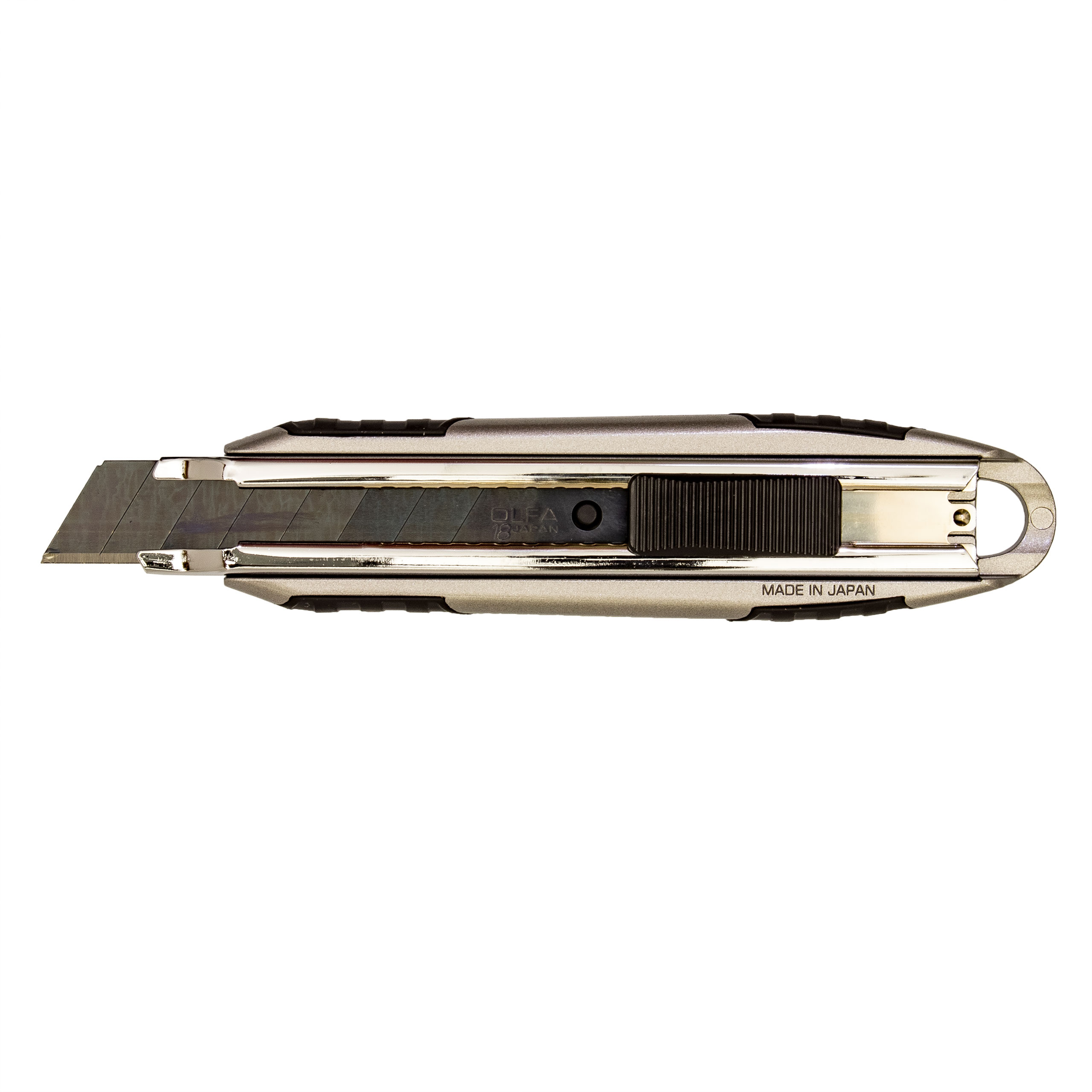 OLFA MXP-AL – 18-mm-Standardmesser. Luxus pur. Besonders robustes Gehäuse aus Aluminiumguss. X-förmiger Griff, rutschfester Elastomereinsatz und stabiler Polypropylen-Kunststoffrahmen. Der Griff wurde ohne Klebstoff gefertigt. Die Klinge aus rostfreiem, verchromtem Stahl zeichnet sich durch hohe Biegefestigkeit und Abriebfestigkeit aus. Schneller und sicherer Halt dank modernster automatischer Klingenverriegelung. Die große Öse am Griffende ermöglicht die einfache Aufbewahrung an der Werkzeugwand.